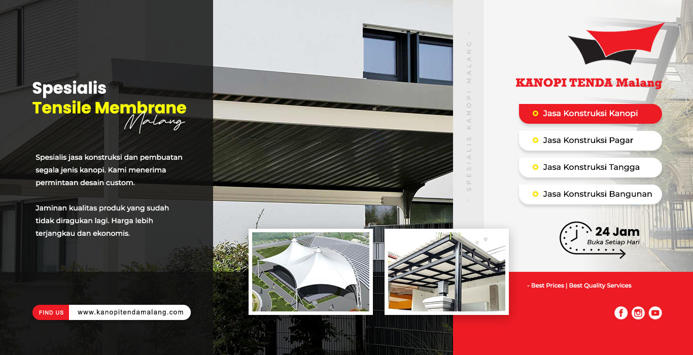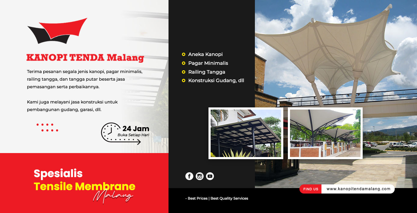 Kanopi Tenda Malang merupakan usaha jasa konstruksi spesialis dalam pembuatan Tenda Membrane / Tensile Membrane Structure. Kami menerima permintaan pembuatan unit kanopi baru beserta dengan jasa pemasangan dan perbaikannya. Jaminan kualitas pelayanan dan produk terbaik yang sudah tidak diragukan lagi.